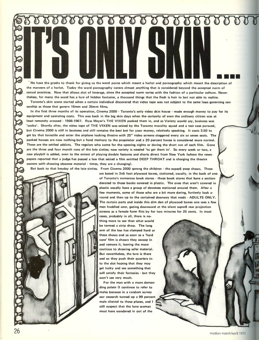 | In This Issue : Arthur Hill Director : Oh Canada ( Film Industry Between 1919- 1930 ) : An Interview With Don Shebib : The World According To John Herbert : Student Standpoint On Super 8 : The Great Debate on Super 8 : It's Only Skin Deep ( A Look At Toronto's Skin Houses ) : Conversation With Arla Saare ( Female Film Editor ) : Show Bits : Class Of '73 (A Look At York University's 4th Year Students ) : Toronto Theater Scene : In Halifax With Keith Turnbull At The Second Stage : Comments : It's Technical : Upcoming Film & TV Festivals CLICK HERE TO READ MORE |